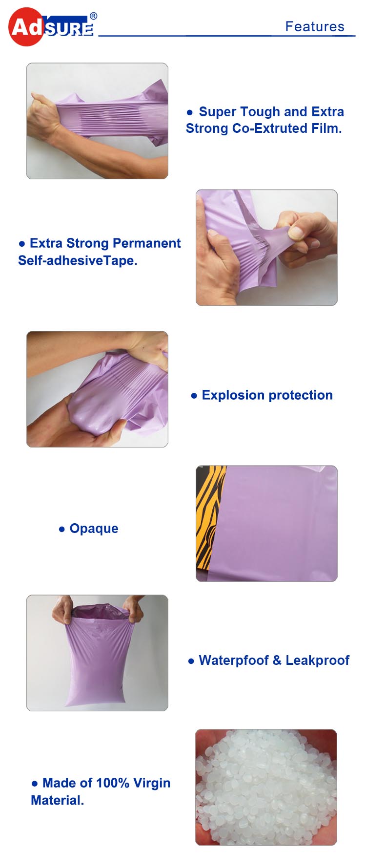 ADSURE®’s Plain Purple Poly Mailers are of the highest quality. We have four colors for you to choose from. ADSURE®’s wholesale poly mailers are made from durable, moisture resistant co-extruded polyethylene and lightweight to save on shipping costs. ADSURE offers puncture, tear and water resistant custom poly mailers for a wide variety of mailing and shipping applications. These bags are perfect for storing and/or shipping clothing, samples, paperwork/files, and a variety of other products. Please email us for quickly quotation:sales01@adsurepackaging.com